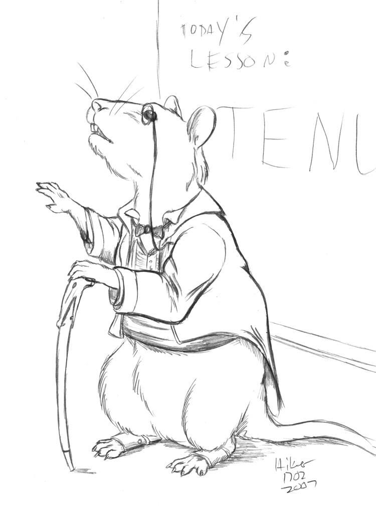 "Tenure, class, is the process by which a professor, such as myself, gains so much senority that he may do almost anything with impunity. For example, giving a lecture without his pants."Here's a change of pace... I don't think I've ever drawn one of these before. I went with the idea when Bluefists suggested "Draw a rat!" Originally I wanted to have him looking all upper-crust and snooty... somewhere along the line he mutated into something that more closely resembles an over-dressed university professor. | |