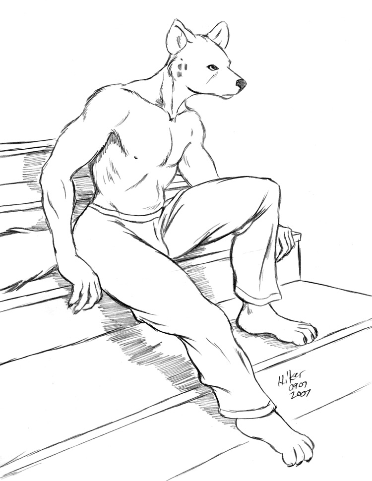 A furry of undefined species on a set of steps... he looks like is is about to spring to his feet.� Perhaps he spotted the bastard that stole his shirt.