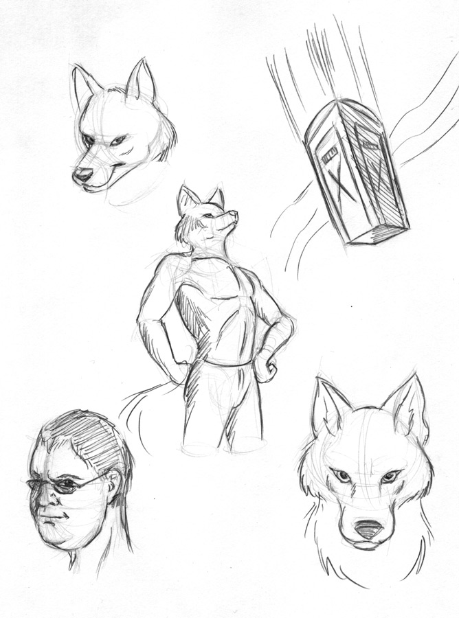 Another brain dump moment. The lower left is a very slapdash attempt at a self-portrait. The upper right is NOT the Tardis. It resembles a port-a-potty in space. The others... standard wolfish doodles.