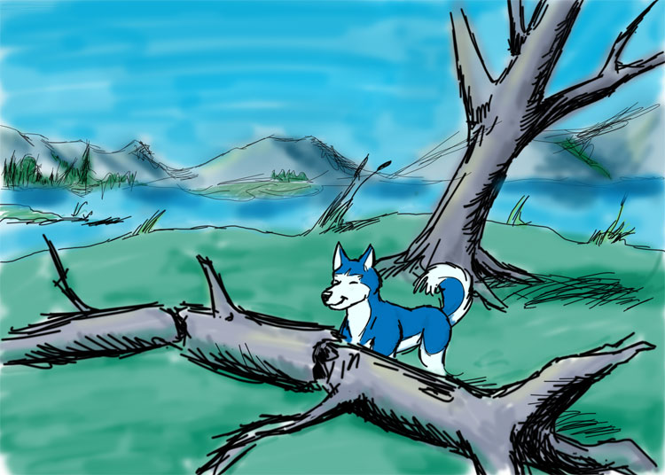I spent about an hour with the Wuffy's new tablet PC, just kind of doodling this landscape. Then, when I was finished, the wuffy said 'It needs more huskies!' and he scrawled where the husky should go. So I took about 5 minutes and added a husky. Woo. Or, as he would say, Woowoowoo.