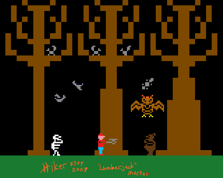 The premise is that you are a lumberjack, hired to fell a deadwood forest. But there is a reason the trees are dead... nuclear waste! Or demonic possession, I haven't decided. The forest is out to get you. Spastic squirrels, flying squirrels, pigeons, bats (not pictured), bears, DEAD bears, and finally a huge fire-spitting demon owl.