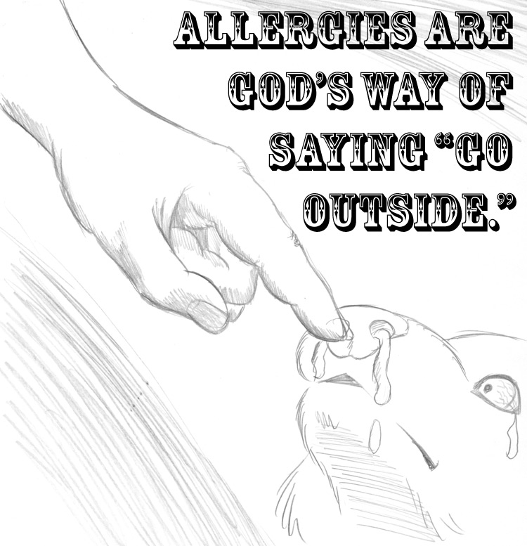 If I stay in the house all weekend, by Sunday I will have a severe allergy attack. I have described these before as "all the moisture in my body escaping through my nose." This is both revolting and accurate.
