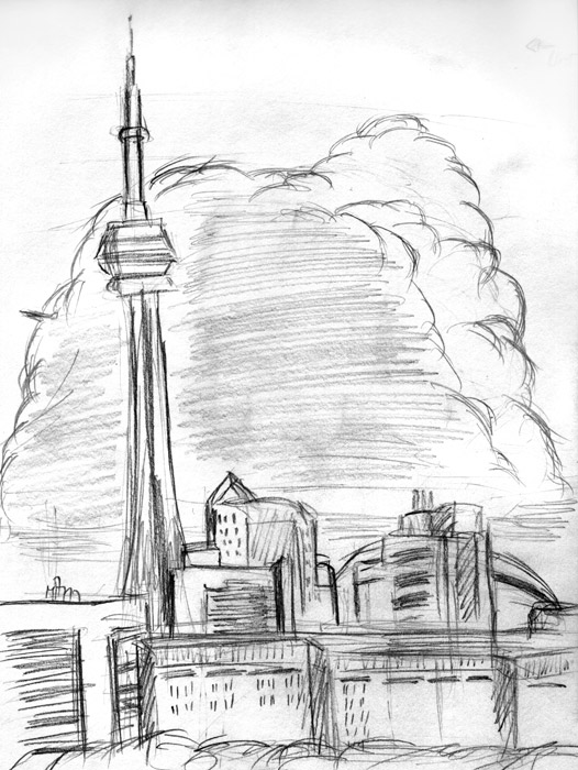 The view from our office window, sketched in haste last night... the giant cloud framing the CN tower was, in a word, awesome.