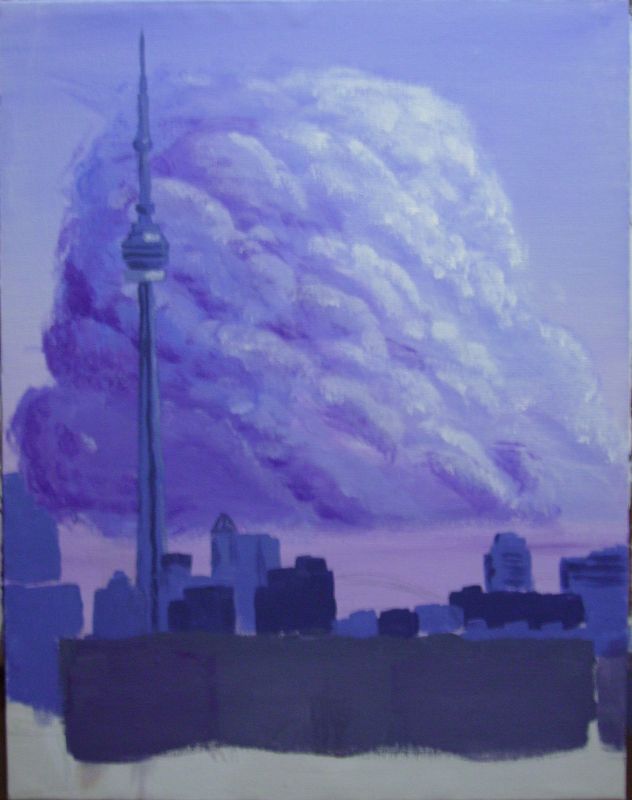 The cloud is super-detailed and the buildings not so much.� This is deliberate, partly because I want the emphasis to be on the sheer size of that cloud, and partly because I haven't the time or patience to fiddle with making the buildings much more than impressions of themselves.