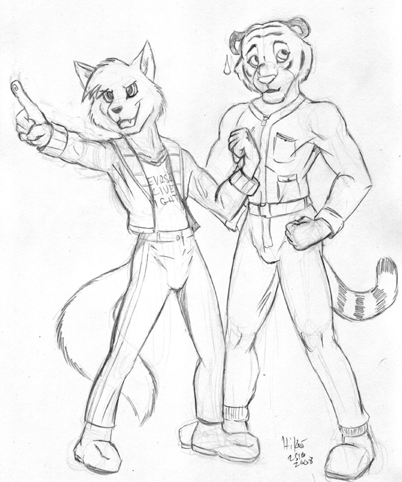 Sandy, on the left, is my character.� He is the cheerfully irritating genki-boy who pilots the Howling Wolf (which I have to draw again at some point.)
