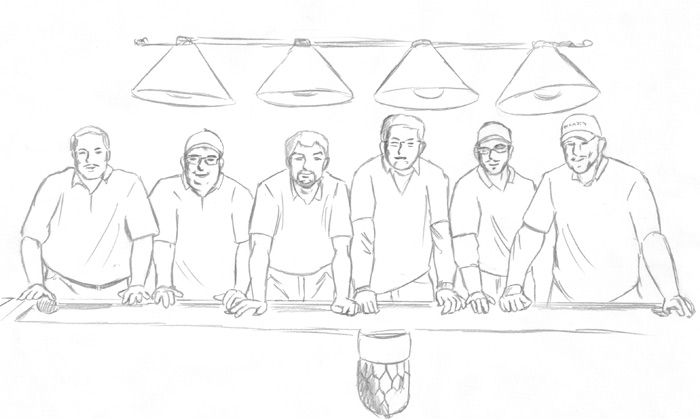 My brother wants a logo for his pool team, and sent me a photograph to work from.� This is about 50-50 trace job/actual art... I'm going to have to clean it up but I need a better photo reference for that. I can't tell if some of these guys have beards or not!