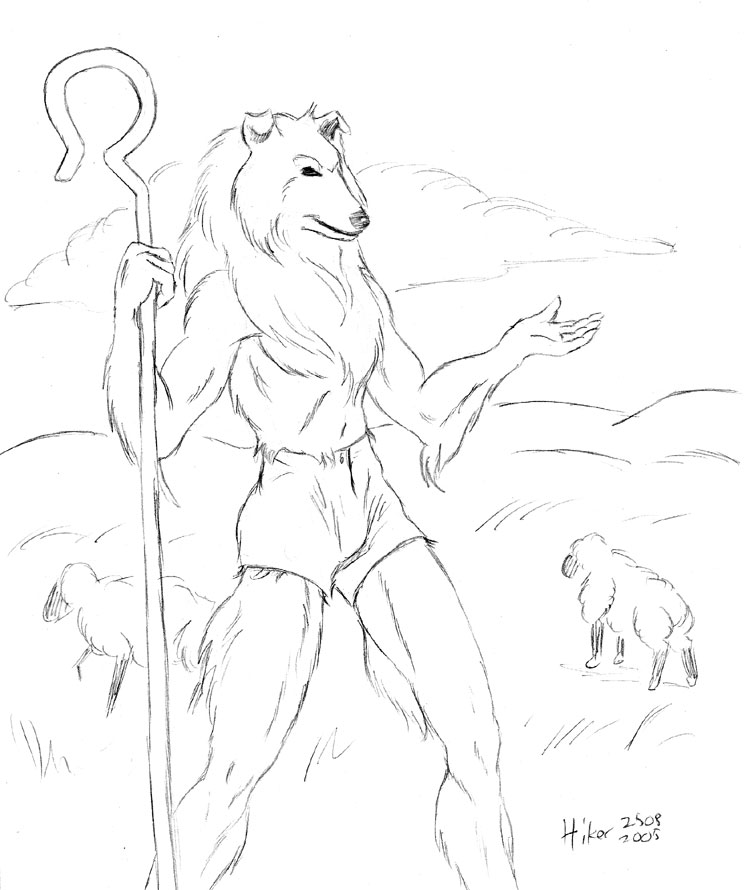 No real explanation for this. I just felt like drawing a collie. The proportions are a bit off because frankly I was focusing on making him as fluffy as possible. In fact the whole picture is a study in fluffiness... clouds, sheep, downy plains of grass...