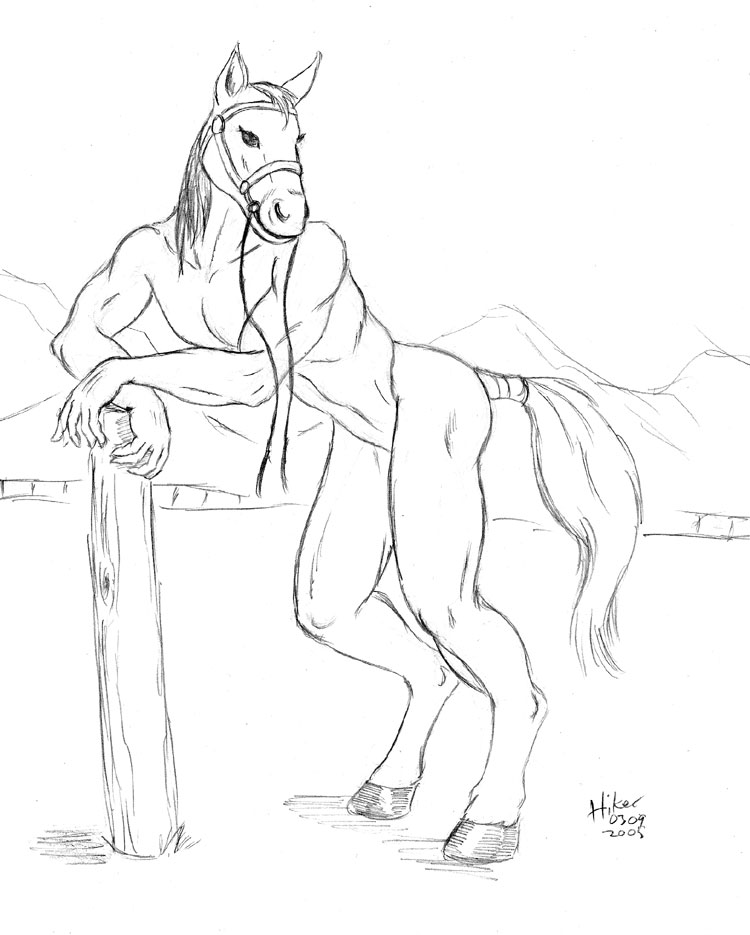 Horses are very hard animals to draw, and very hard to 'furry'. The two keys to drawing them well seem to be reference and more reference. I needed pics for the head (easy) and pics for how to work the hind leg joints (hard).