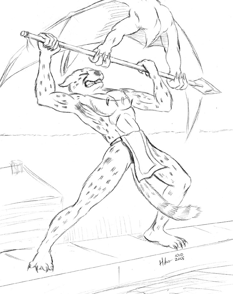 A small pteradon may prove Bunta's undoing, as it forces him to the edge of a decaying roof. They grapple over the spear, Bunta balanced precariously...