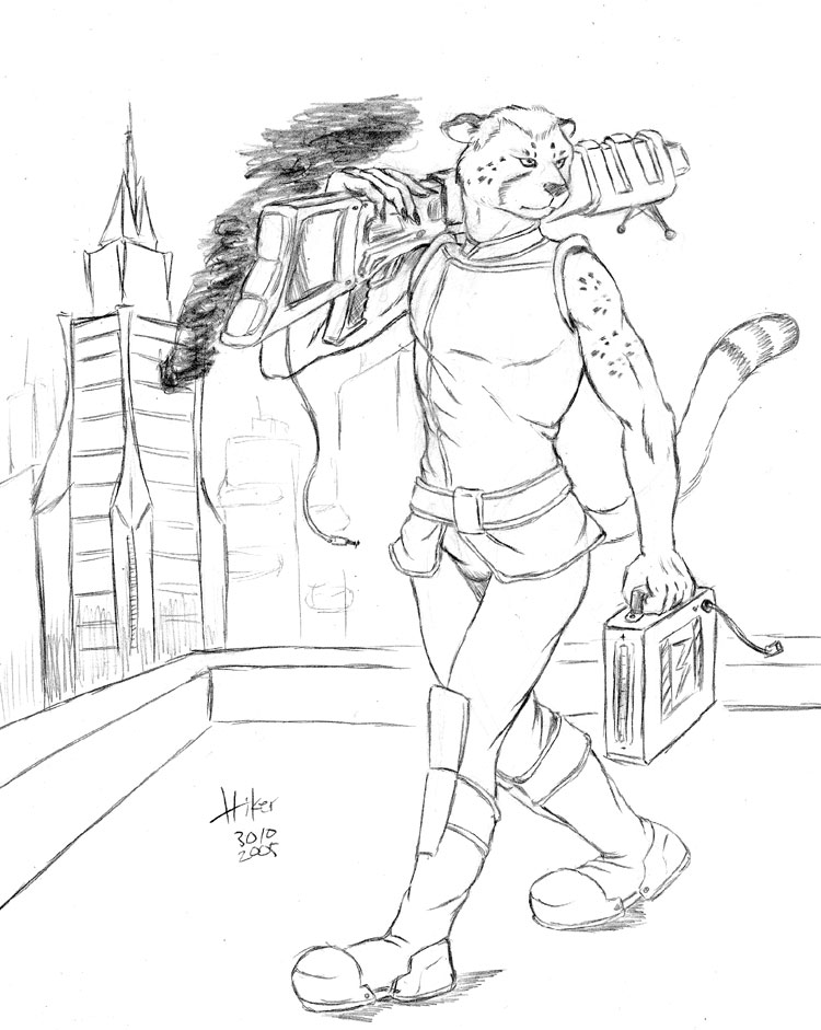 The influence here was mostly Doom... the game, not the movie. I've been wasting some time lately with the original pixelated classic, via a neat utility called ZDOOM. Also, I had thumbnail sketchs of Illchor with a big gun lying around. So hey, two birds with one stone. Or one sustained ten-second burst. Whatever.
