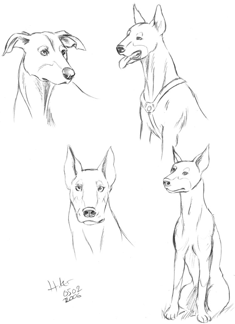 I'd never actually tried to draw dobermans before, so it was off to Google for some reference.� Their faces are actually quite fascinating.� The sleek, flat fur makes it easy to see their structure.� The nose and muzzle were thicker than I'd been led to believe, and their heads are quite flat on top.�