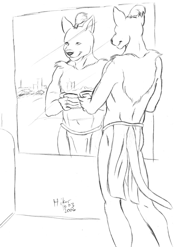 The exact details call for Leinir to be looking out of his basement apartment window, holding a teacup, with himself reflected in said window. I'm having a bit of trouble with the composition. Reference photos from (ahem) various sources have helped.