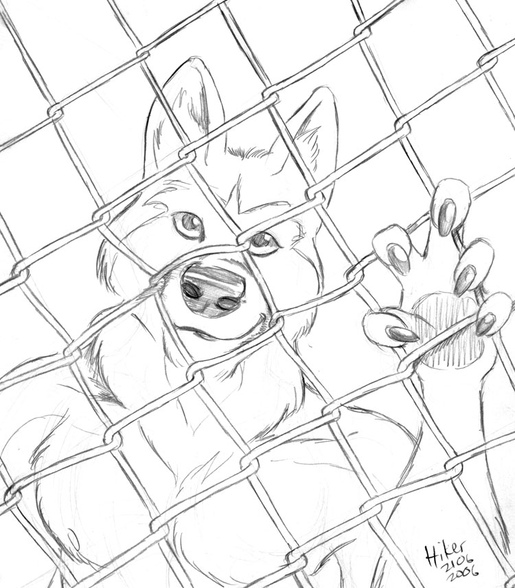 I'm sort of happy with it... the wuff himself looks a bit rushed, but the eyes are great, and I am amazed I was able to draw chainlink this good. That's freehand linkage. Uncanny.